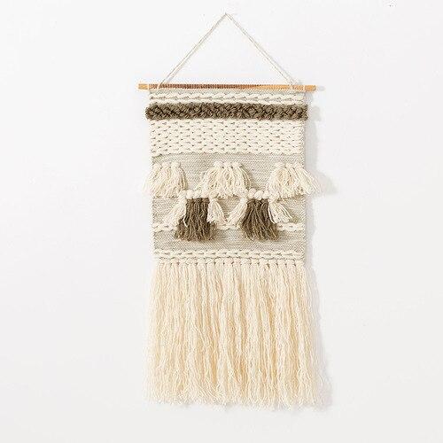 - Bohatá textura: Kombinace různých typů tkaní, roztomilých střapců a volně visících třásní dodává hloubku a zajímavost.