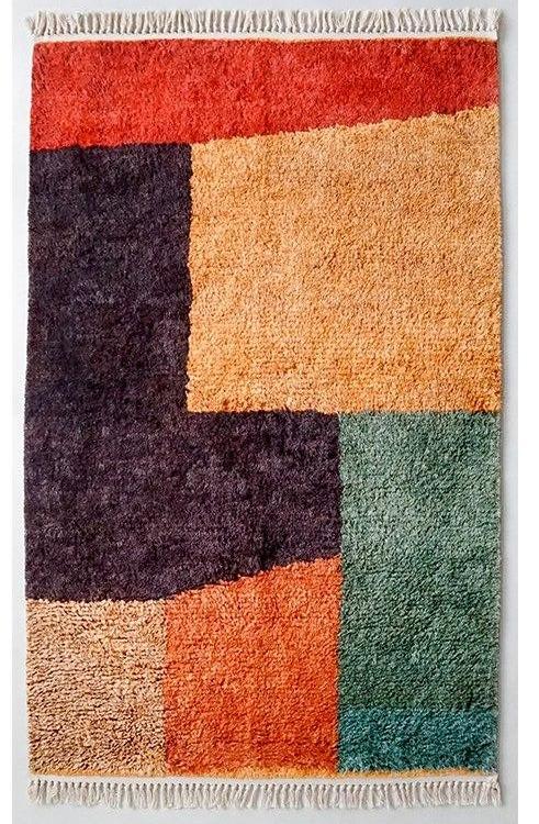 Hledáte prvek, který promění Váš obývací pokoj, ložnici či pracovnu v oázu pohodlí a stylu? Náš jedinečný režný a hnědý koberec shaggy styl je přesně to, co potřebujete! S jeho bohatou texturou a hlubokými barvami vnáší do každého prostoru pocit tepla a útulnosti. Představte si, jak se Vaše bosé nohy zaboří do jeho měkkého vlasu po dlouhém dni – čistá radost a relaxace. Design koberce s nepravidelnými geometrickými bloky v odstínech přírodní režné, syté hnědé, živé terakotové a uklidňující tmavě zelené vytváří moderní a zároveň nadčasový vzhled, který dokonale doplní širokou škálu interiérů od boho po skandinávský.